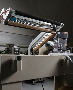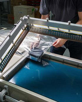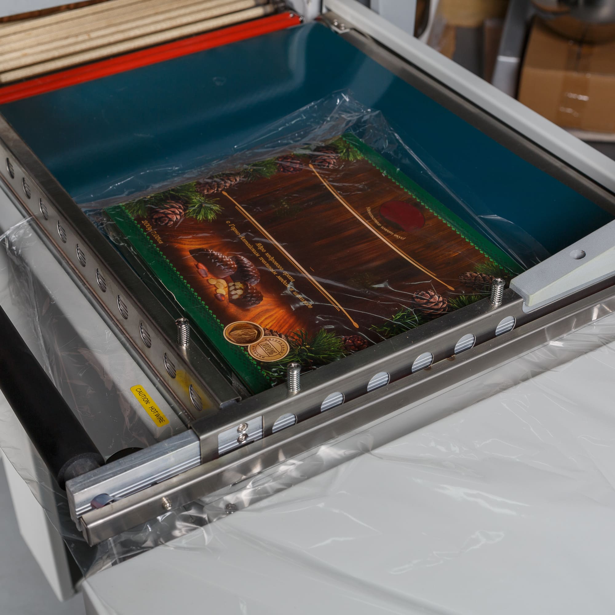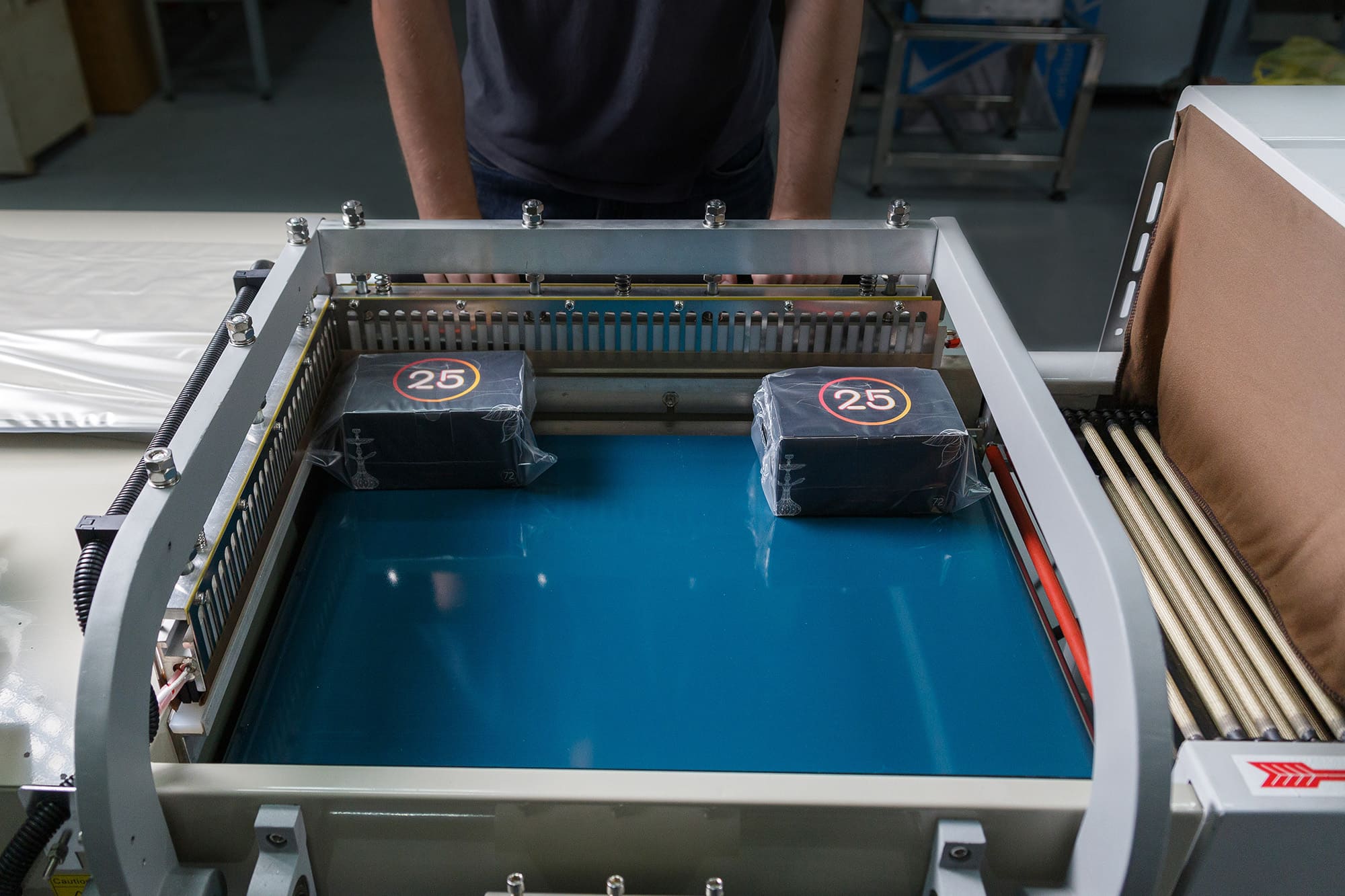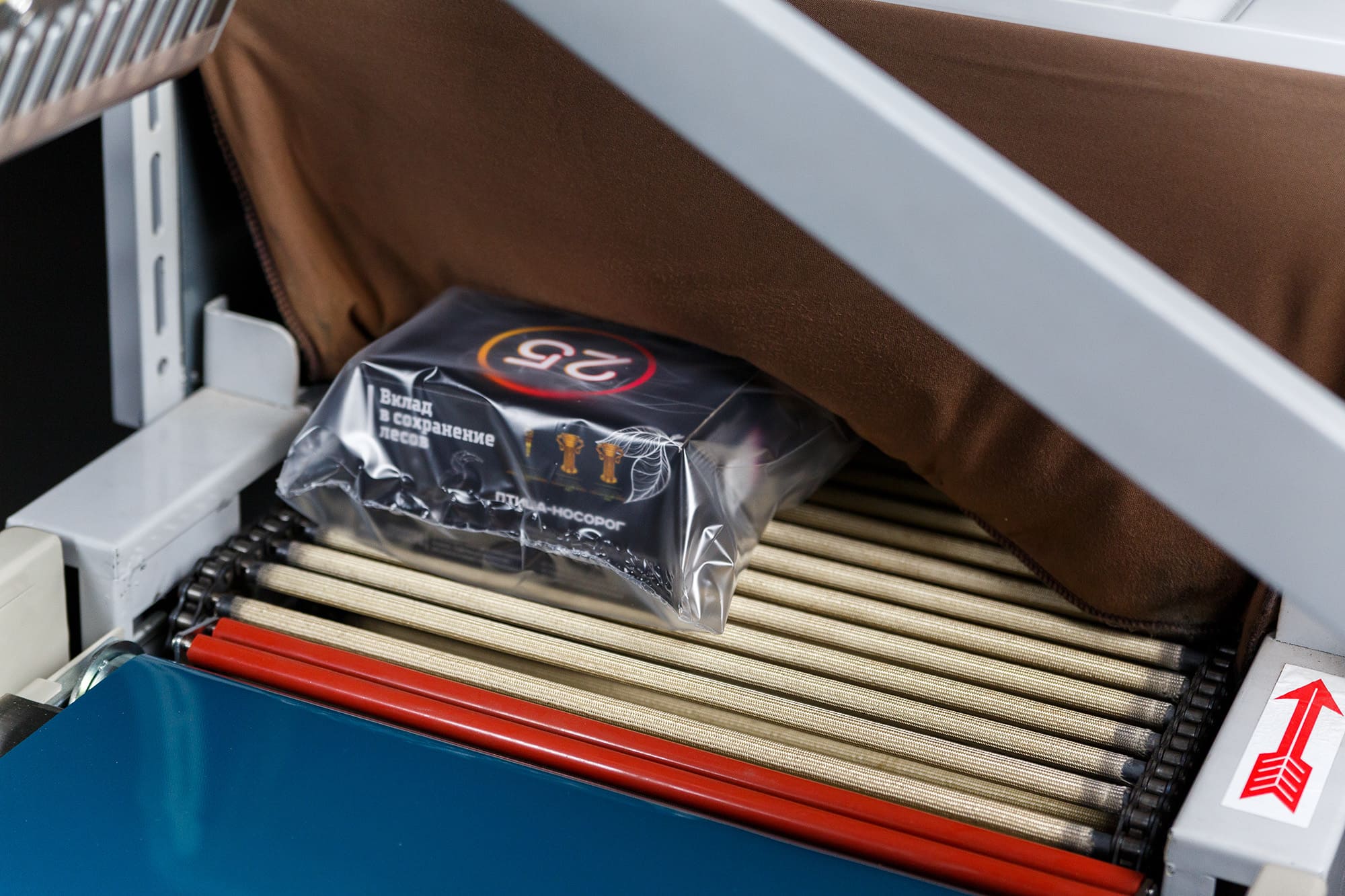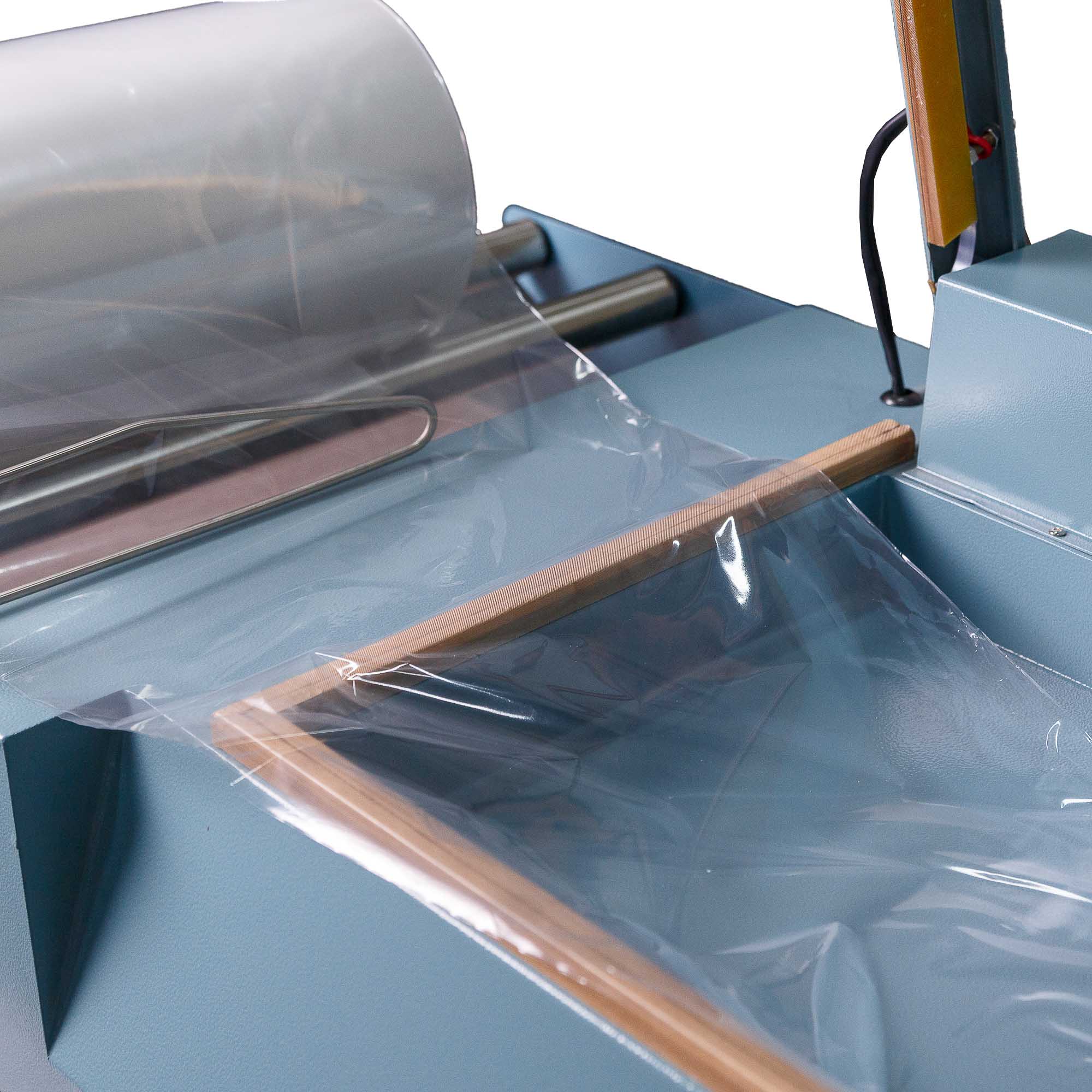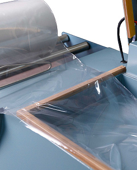 - Формирование пакета: Оператор отматывает нужный отрезок пленки, формирует полурукав, натягивает его на товар и отрезает, прижимая пленку к ножу.