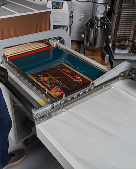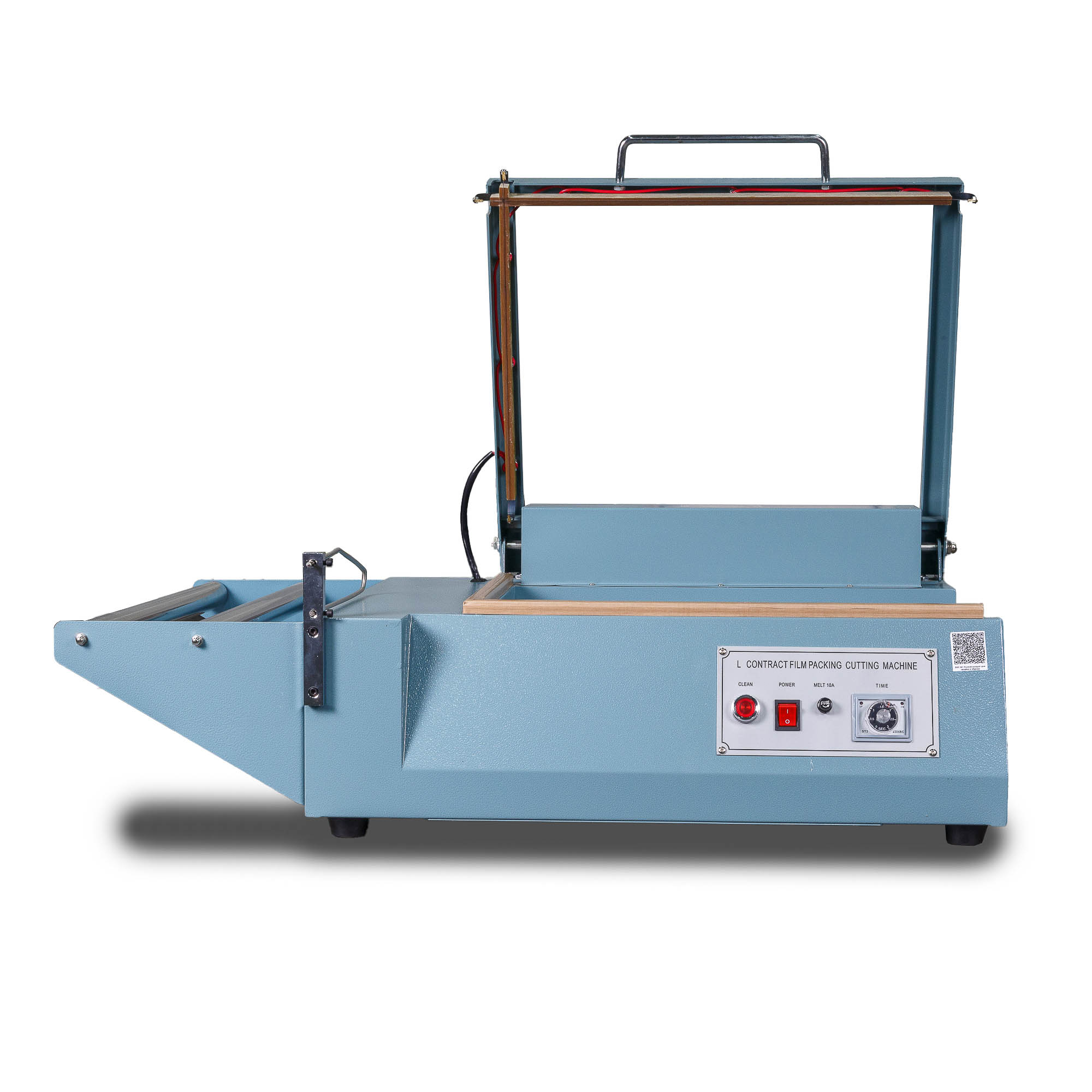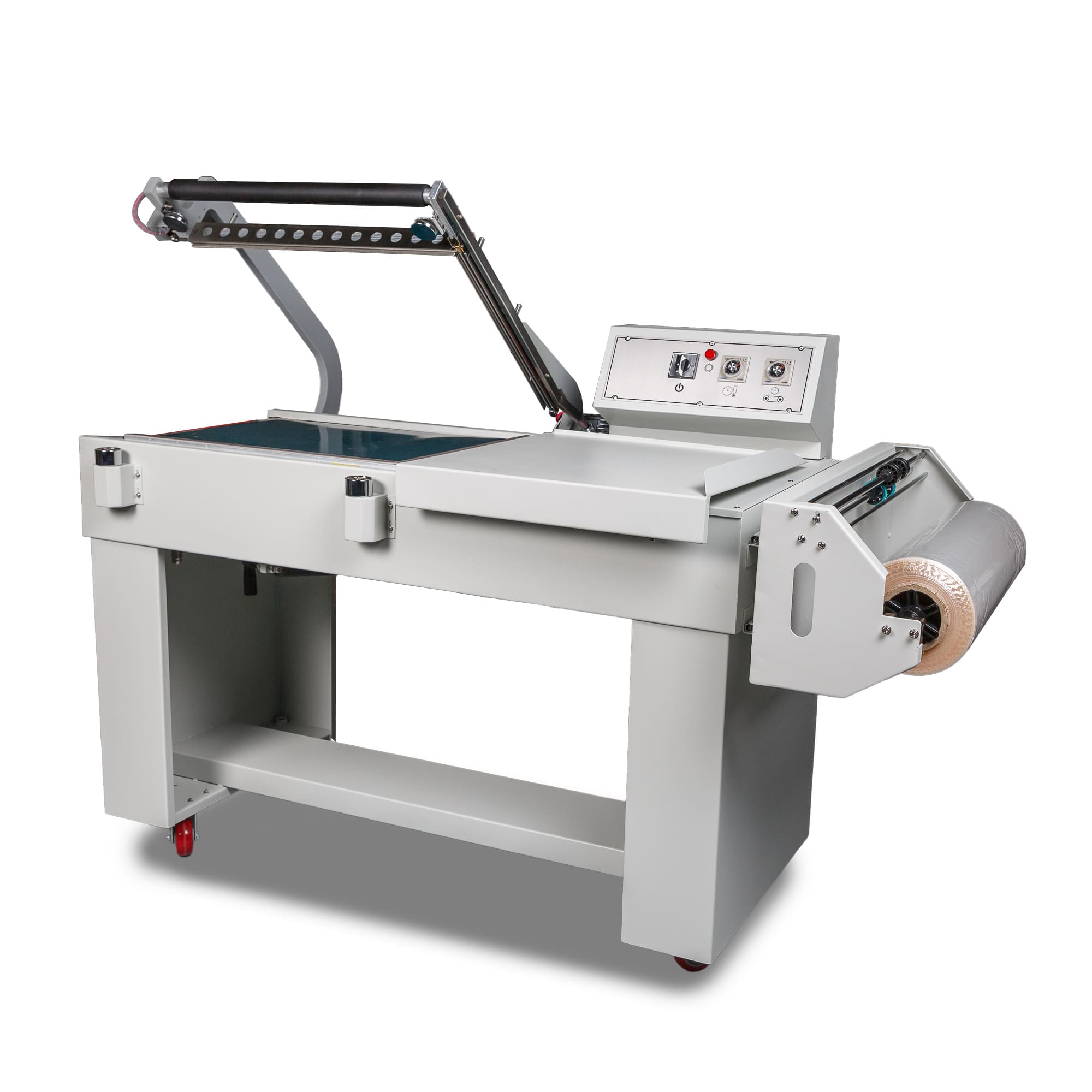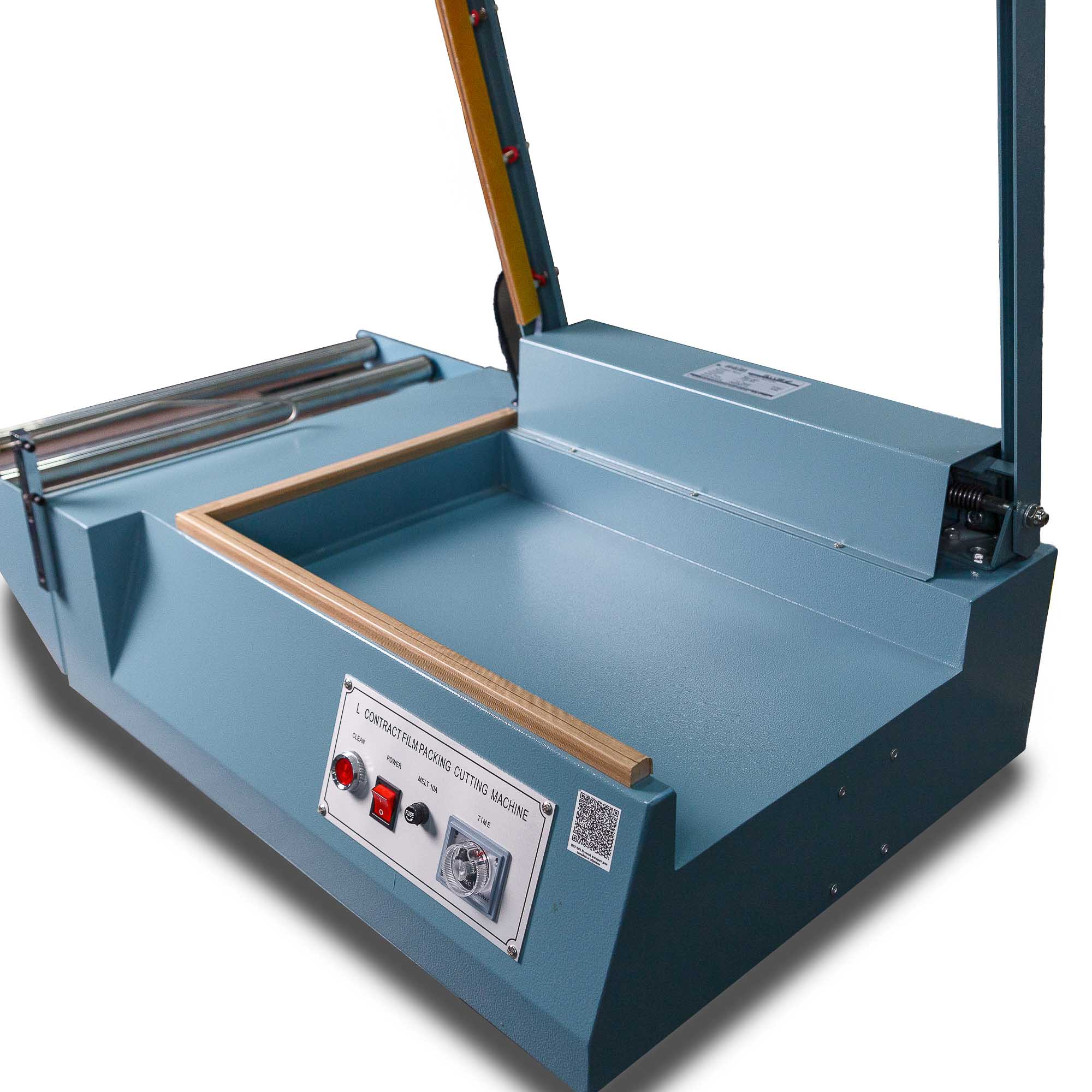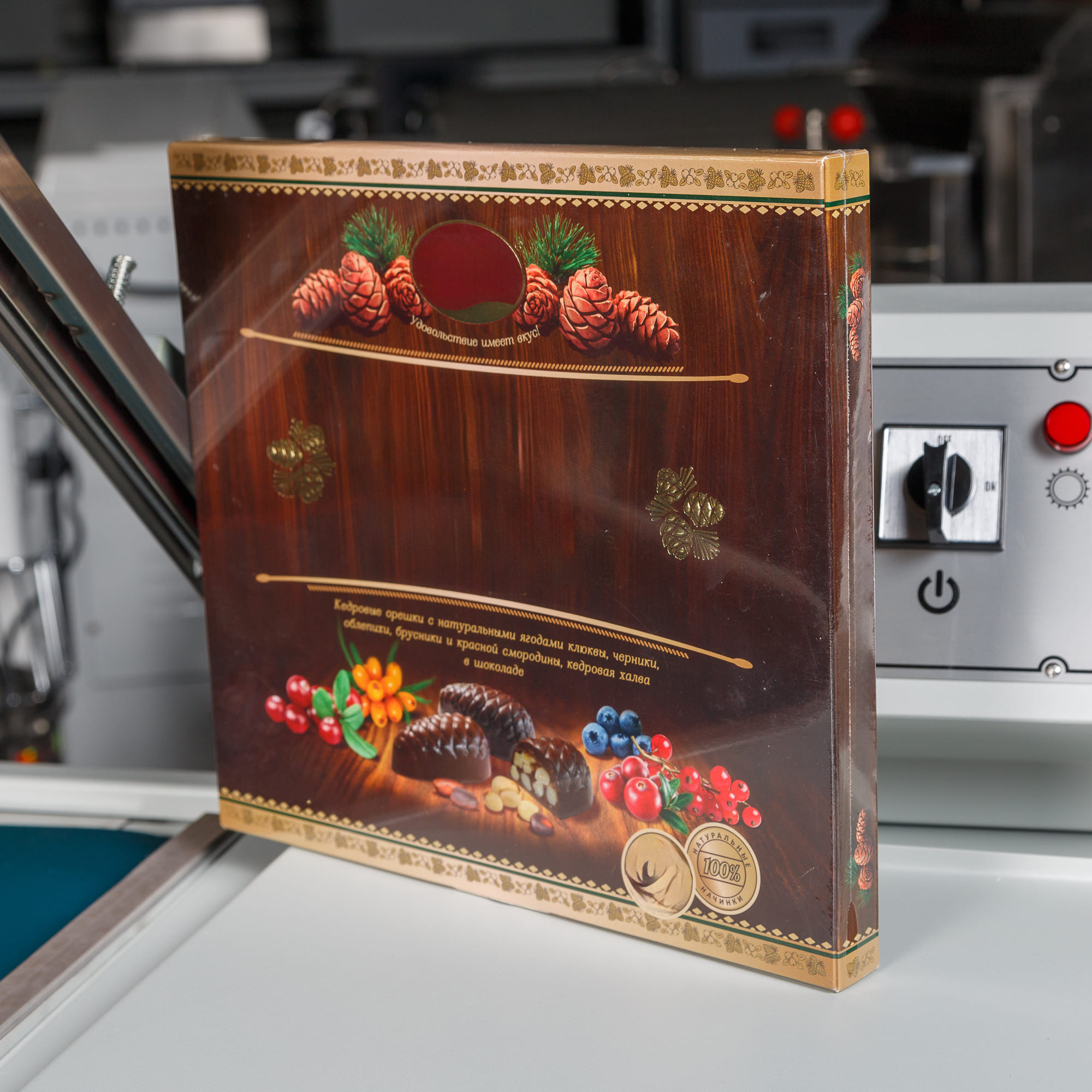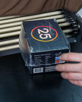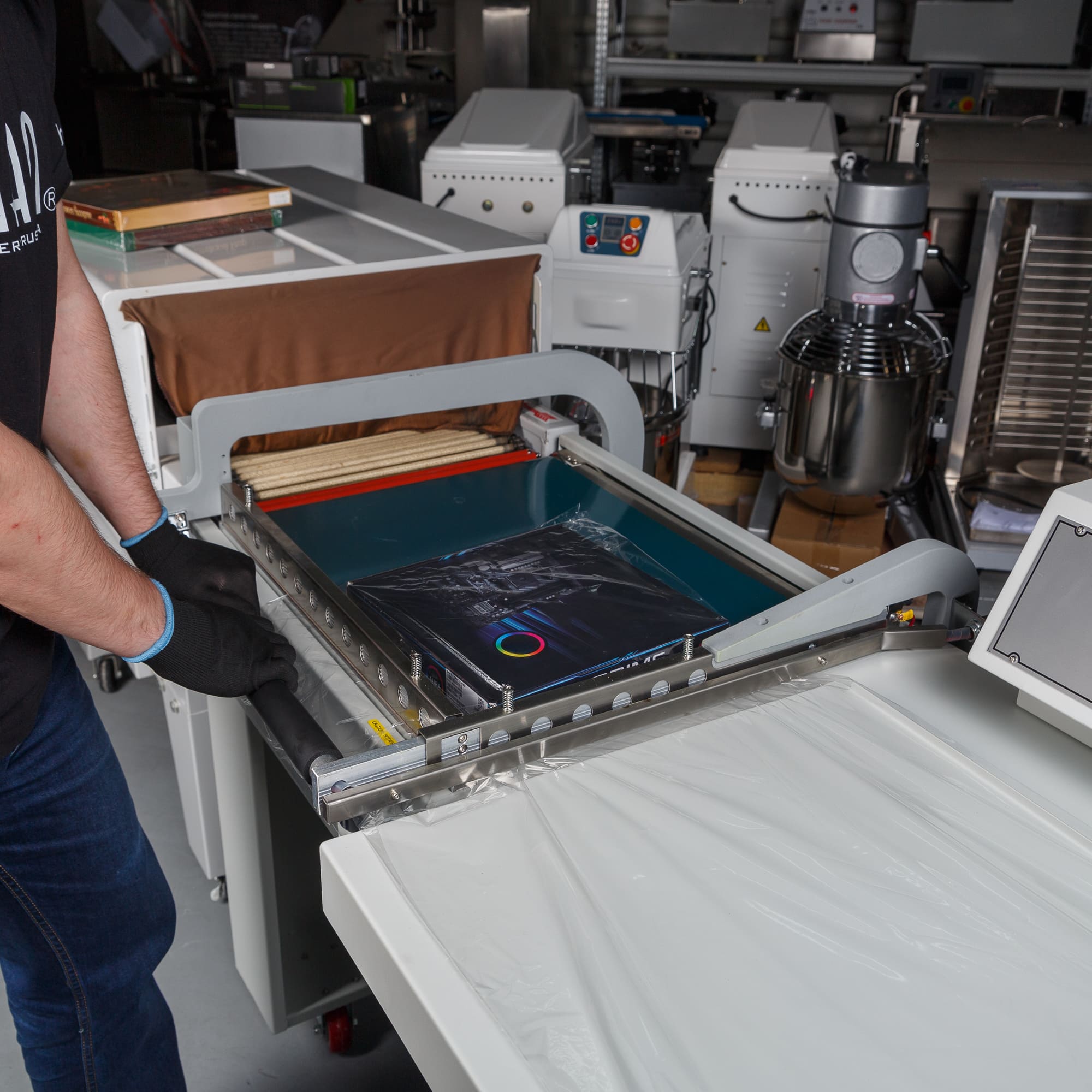 - Формирование пакета: Оператор отматывает нужный отрезок пленки, формирует полурукав, натягивает его на товар и отрезает, прижимая пленку к ножу.