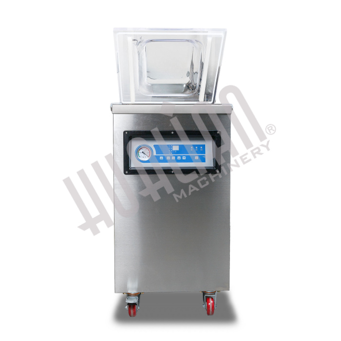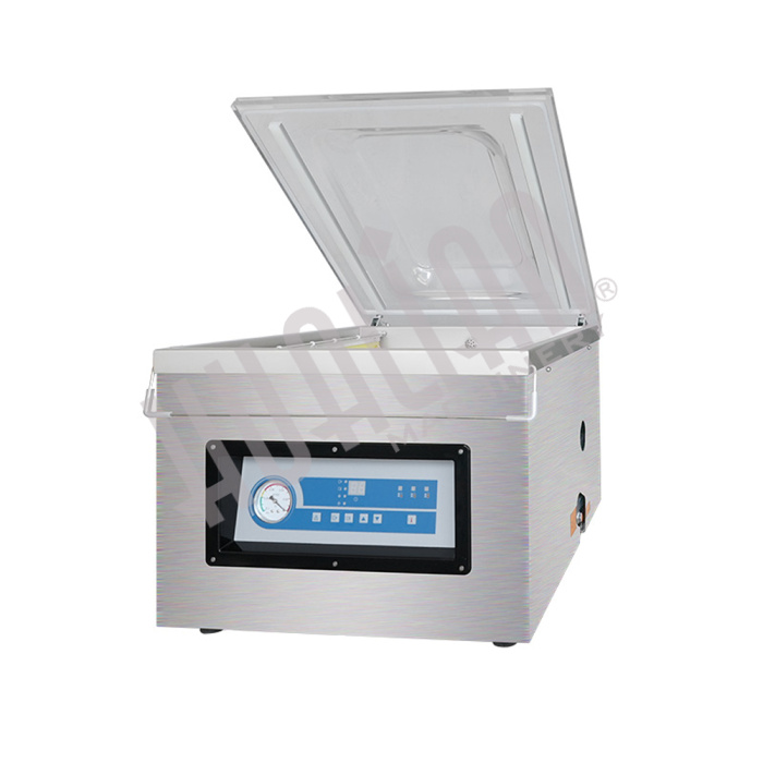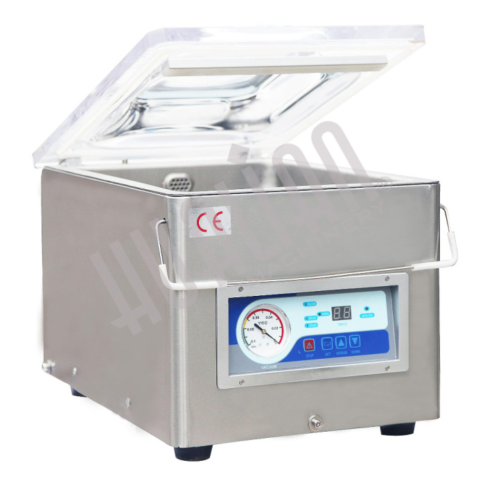 Камерные машины— подходят для крупных производств. Модели имеют мощность от 600 Вт и оснащены одно или двумя камерами, куда помещается продукт. Например, однокамерная компактная модель настольного вакуумного упаковщика DZ-260 популярна для малого бизнеса. Используется для фасовки кофе, орехов, снеков.