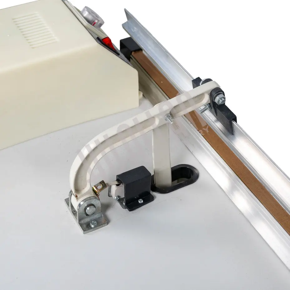 Управление запайщиком осуществляется посредством ножной педали, что упрощает работу оператора и оставляет свободными руки. Импульсная запайка обеспечивает экономичное энергопотребление. При этом качество сварного шва остается неизменно высоким за счет равномерного распределения усилия по всей длине запаечной планки – прижимные губки закреплены четырьмя тягами. Длина запайки 800 мм.