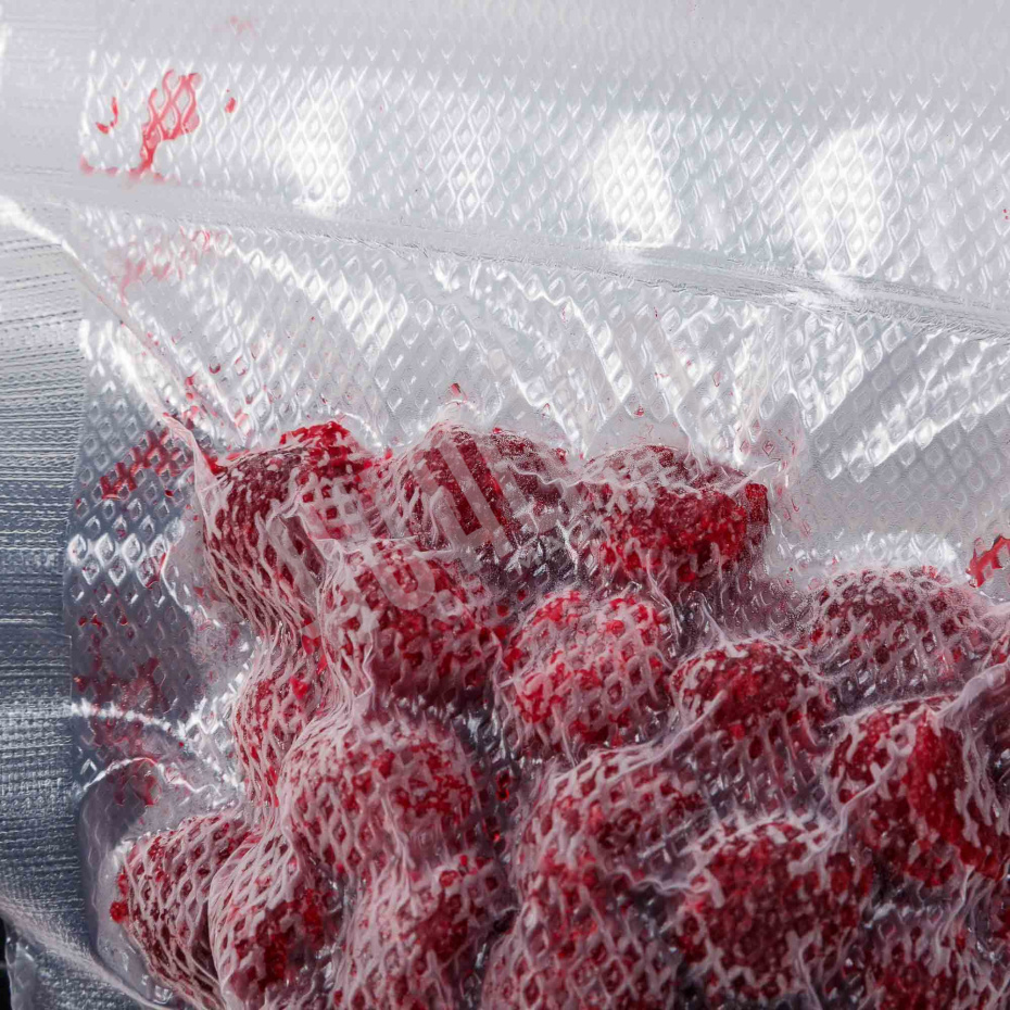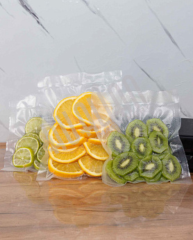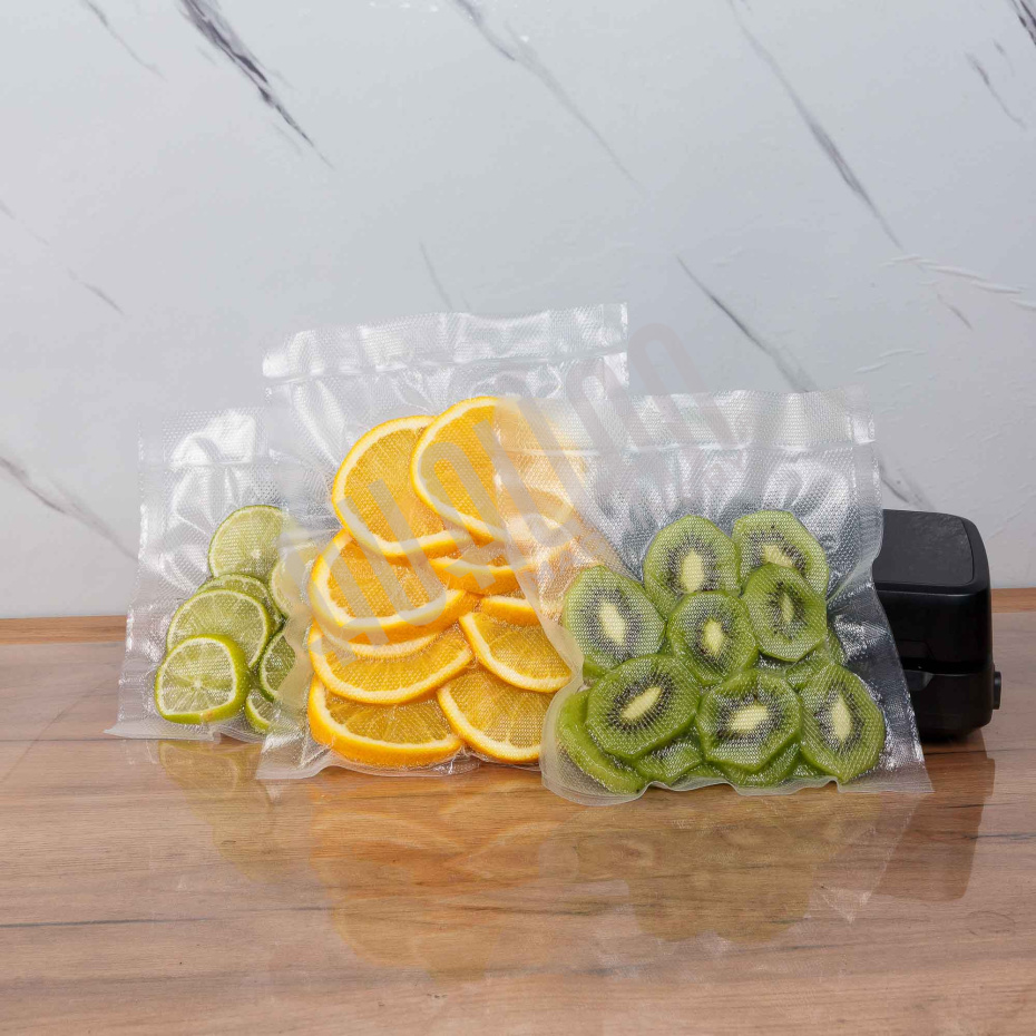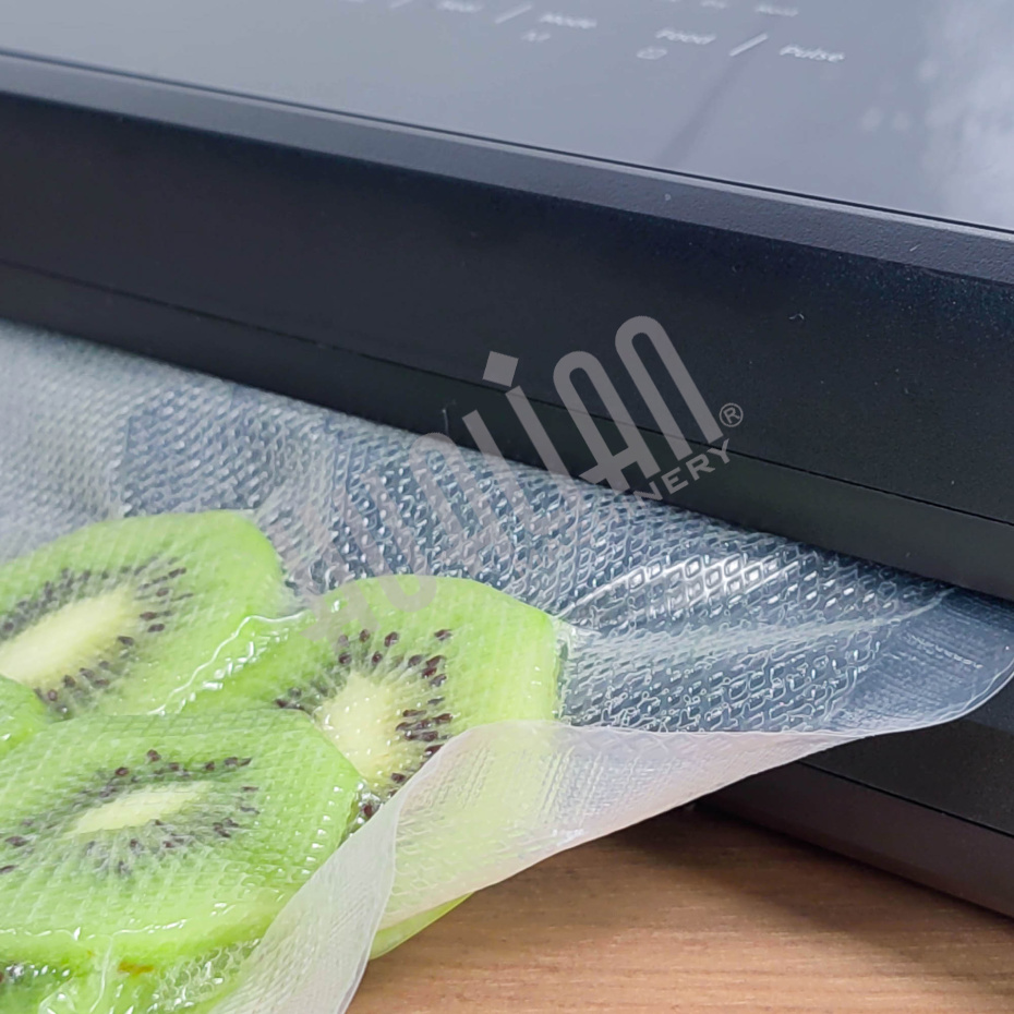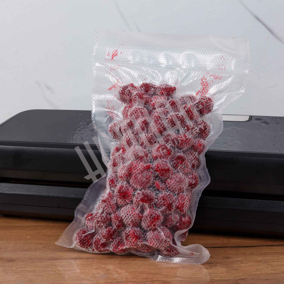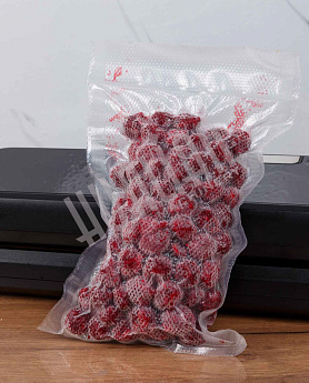 - Работа с рифлёными пакетами – обеспечивает плотное прилегание пленки и надежную герметизацию даже для продуктов с неровной поверхностью, таких как ягоды или нарезка.