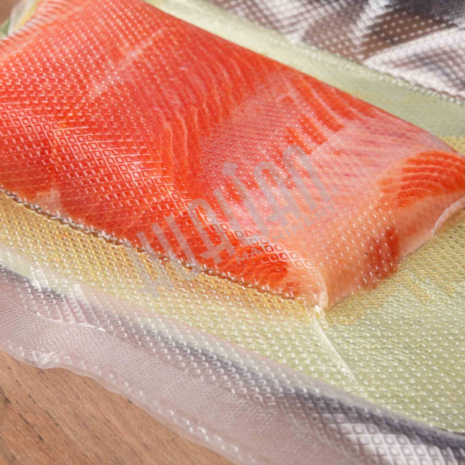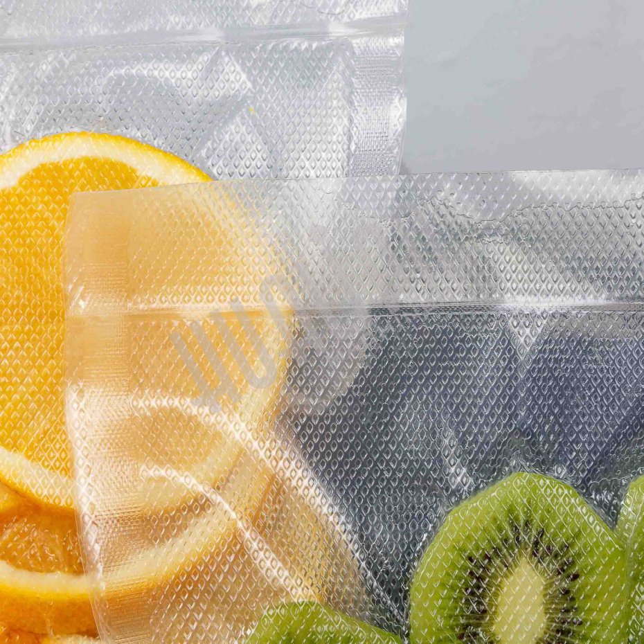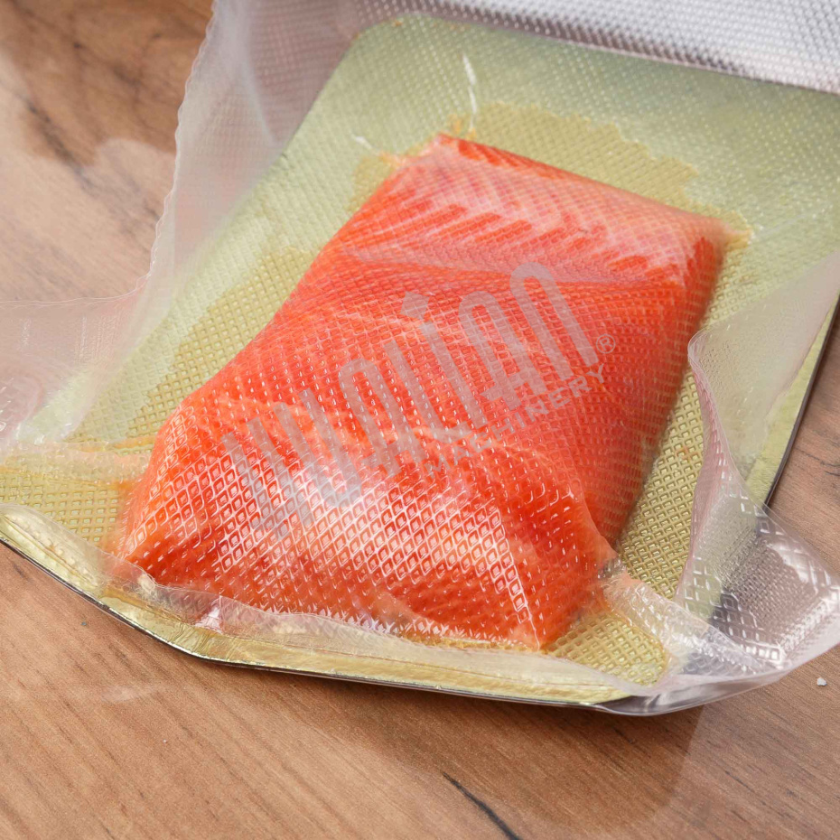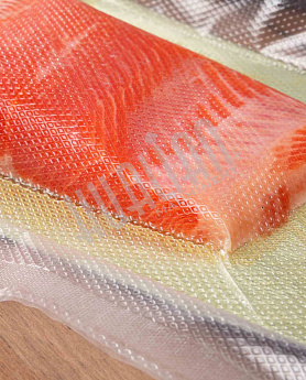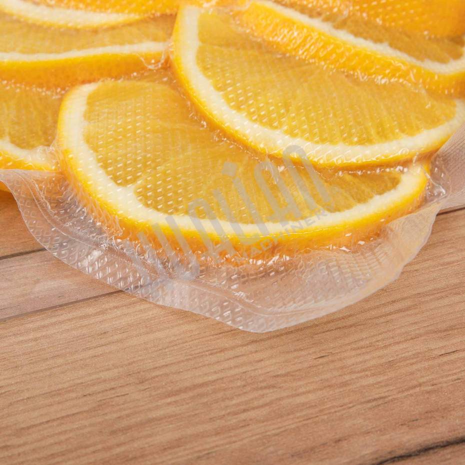 - Работа с рифлёными пакетами – обеспечивает плотное прилегание пленки и надежную герметизацию даже для продуктов с неровной поверхностью, таких как ягоды или нарезка.