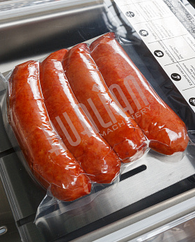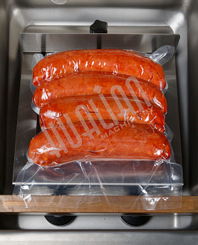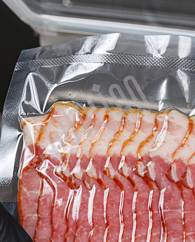 настольного вакуумного упаковщика HVC-210T/1D. Для упаковки использовались свежие продукты: копченая колбаса в нарезке, бекон в нарезке, куриные ножки в маринаде, шпикачки. Устройство успешно справилось с задачей, упаковав три группы каждого вида продукции.