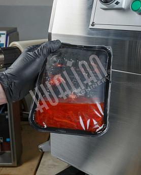 В ходе тестирования проверялась работа запайщика на готовых продуктах: гречке, супах, блинах и котлетах. Оборудование показало стабильную работу, обеспечивая герметичность и аккуратность упаковки.
